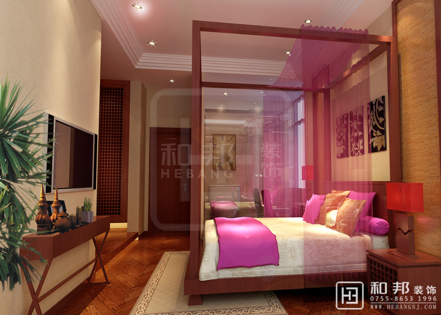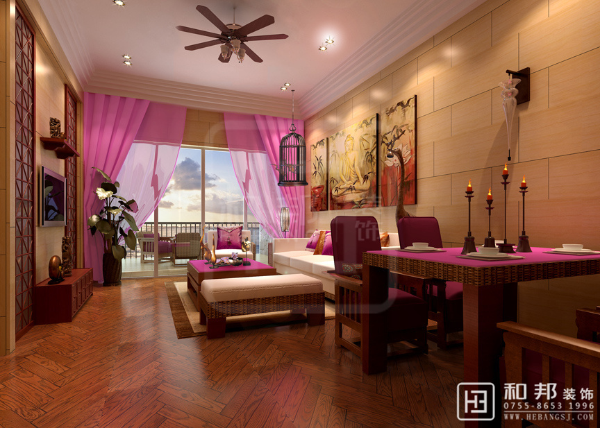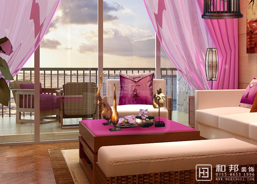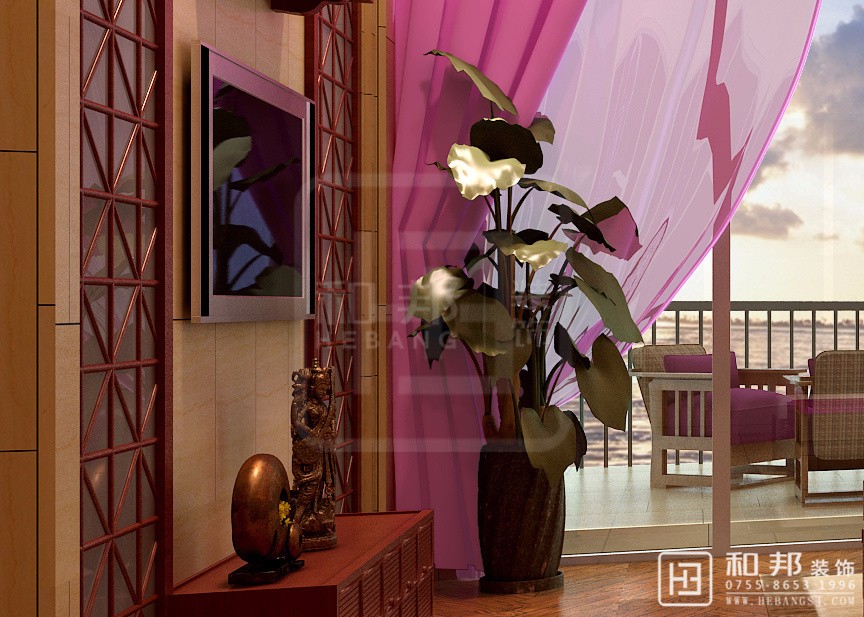 客廳以大氣優雅為主,主要采用天然的木制品制作的工藝品,其中主要體現在客廳中的木制家具和其他裝飾性的工藝品,同時采用色彩鮮艷的粉紫色點綴整體色調。